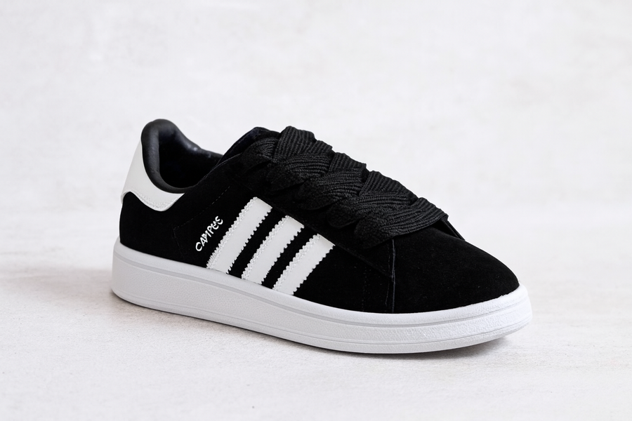 كوتشي Campus Noir بتصميم كلاسيكي أنيق، يجمع بين الشمواه الأسود والخطوط البيضاء، مثالي للستايل الحضري والطلعات اليومية.