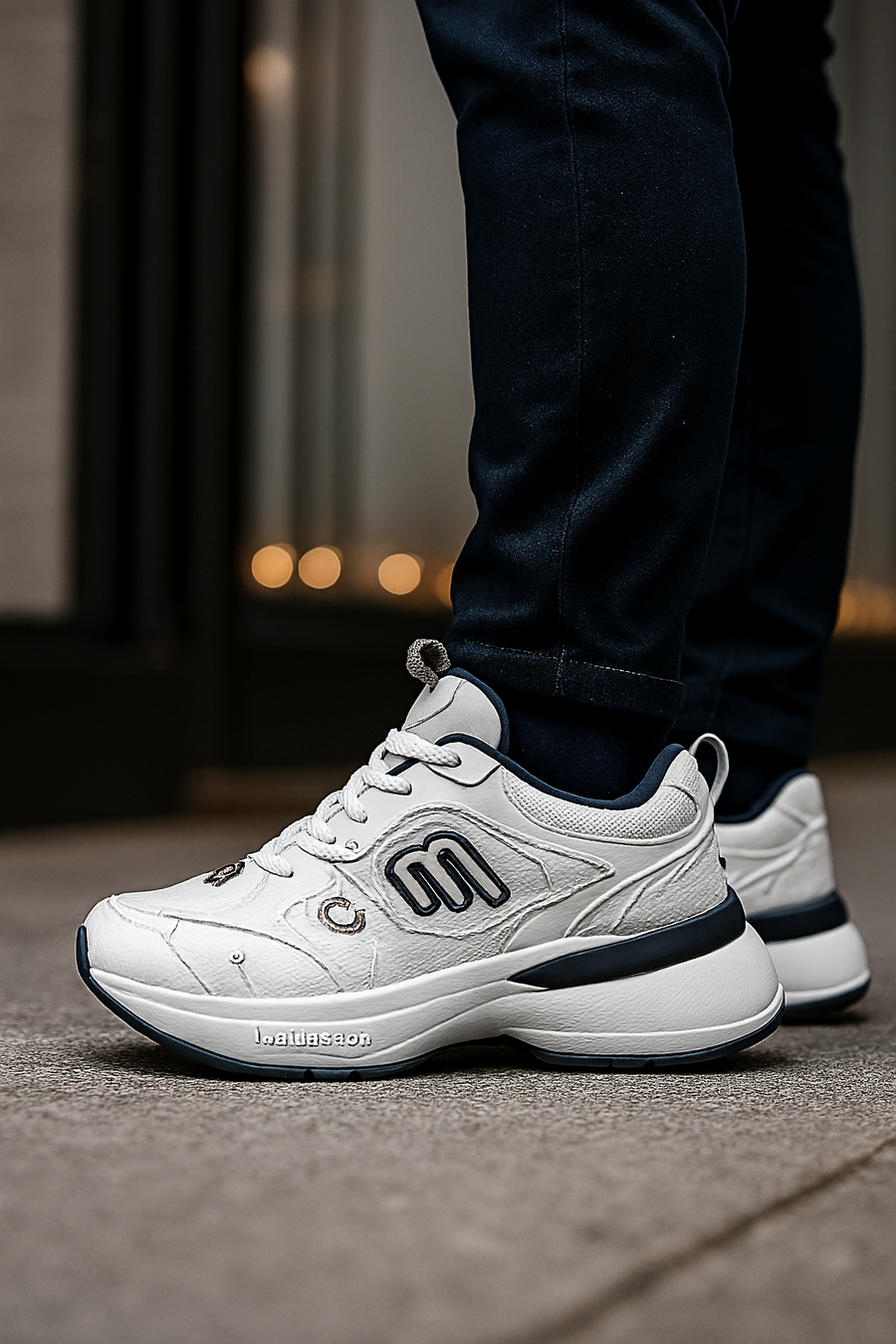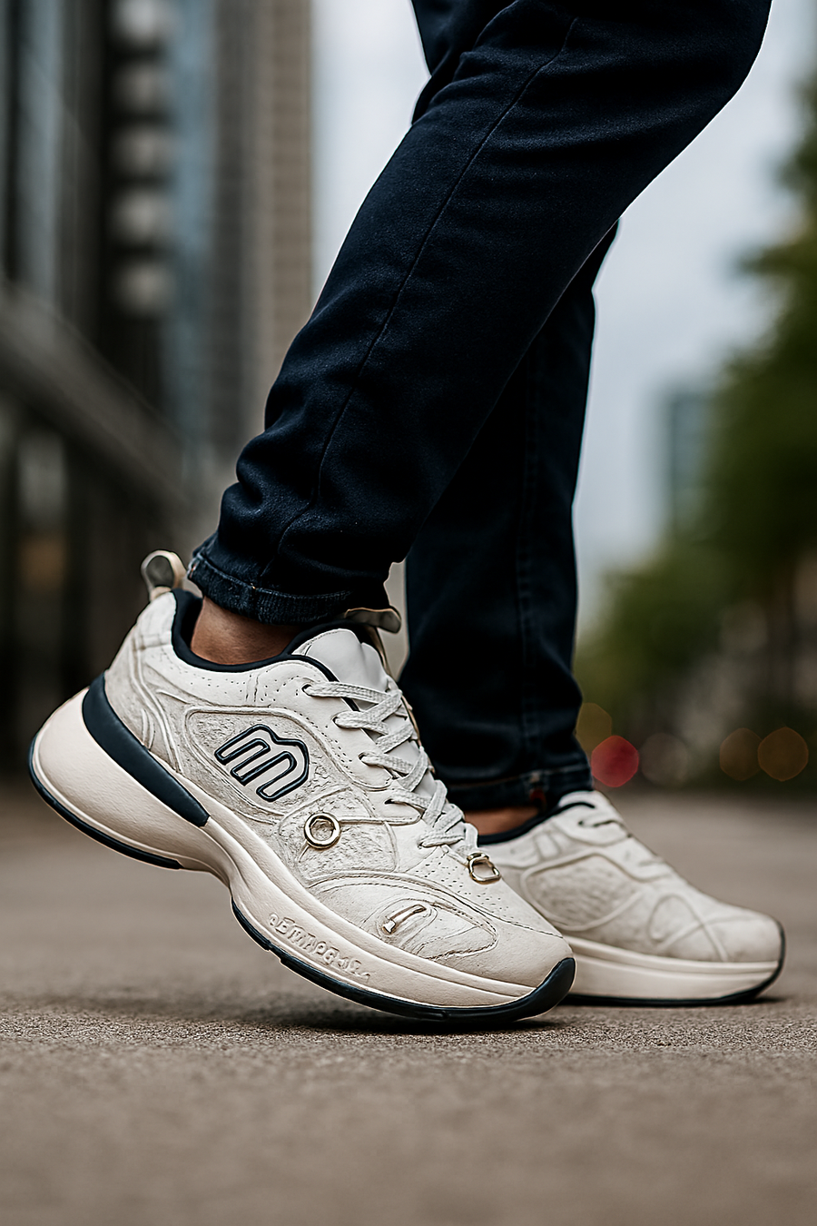 ألوان متناسقة: الأبيض الأساسي مع لمسات سوداء ورمادية تمنح الحذاء طابعًا أنيقًا.