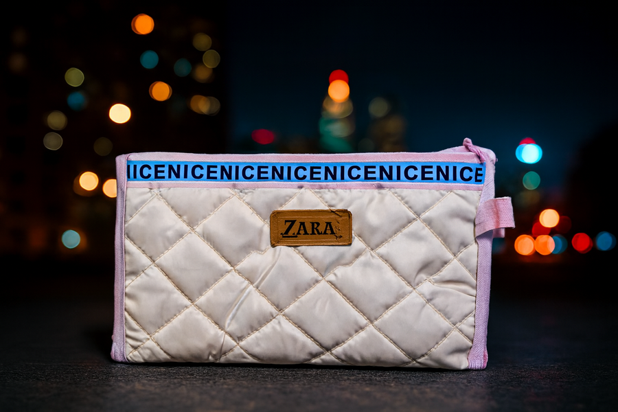 حقيبة مبطنة أنيقة من ZARA بلون وردي ناعم، مزينة بشريط NICENICE وزر جلدي فاخر. مثالية لحمل مستلزماتك اليومية بأسلوب عصري.